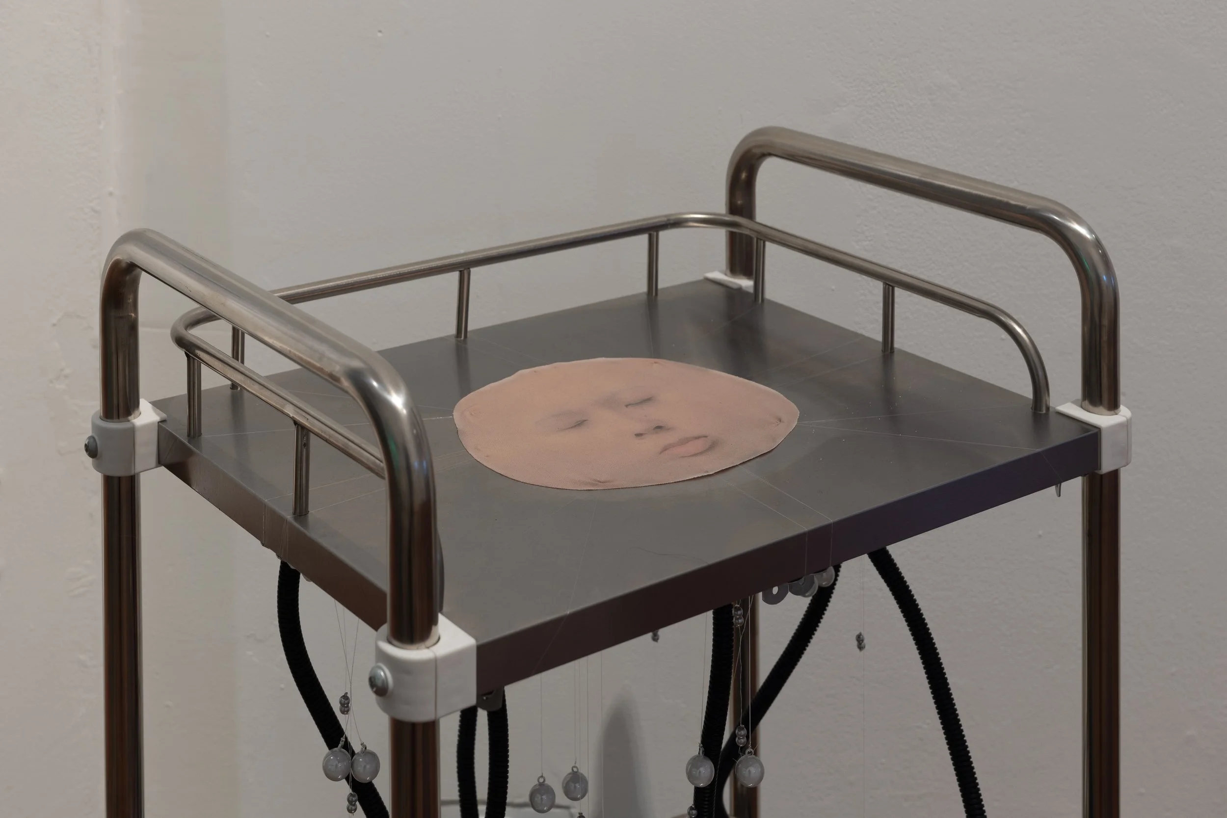 Face Lift, a machine-like sculpture with Ivy’s printed face stretched across it, which moves when approached by an individual. Below the table holding her stretched face, beads and bells are attached to the servos, these collide with each movement to produce a soft meditative chime. At first glance, the sculpture appears mechanical, yet on closer inspection a human face emerges that breathes in rhythm to a person’s presence. The sculpture exists as both person and machine, playing with the idea of personal identity and performance.